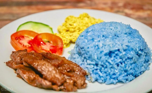A must-taste juicy vegan silog with the unusual-colored rice.