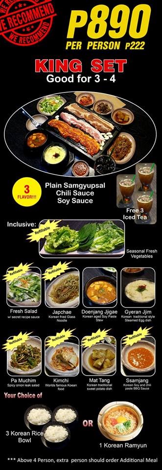 Samgyupsal king is one of the best! It fits to everyone where you can share with your family, friends and to other people you know! Even though it is not unlimited. The Samgyupsal king will satisfy your hunger.